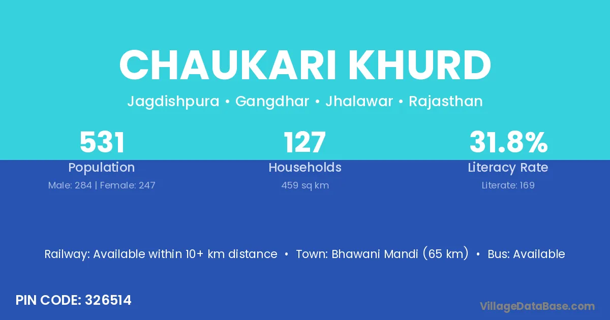 Bhawani Mandi (65 km) is the nearest town to Chaukari Khurd village for major economic activities and is located approximately 65 km away.