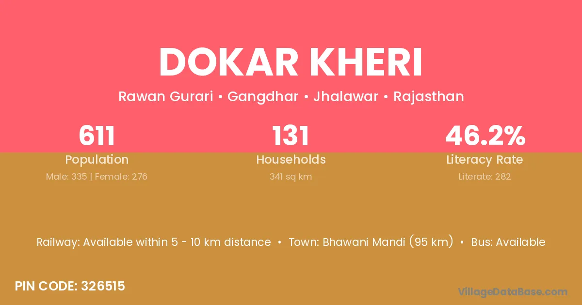 Dokar Kheri village has a total population of 611 people, of which 335 are males and 276 are females.