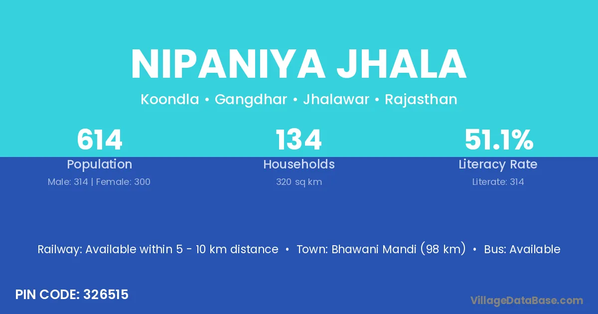 Nipaniya Jhala village has a total population of 614 people, of which 314 are males and 300 are females.