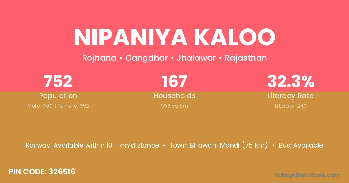 Bhawani Mandi (75 km) is the nearest town to Nipaniya Kaloo village for major economic activities and is located approximately 75 km away.