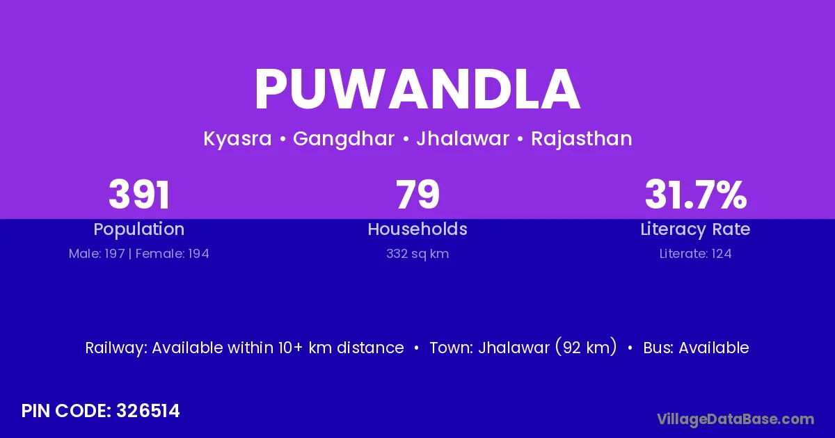 Jhalawar (92 km) is the nearest town to Puwandla village for major economic activities and is located approximately 92 km away.