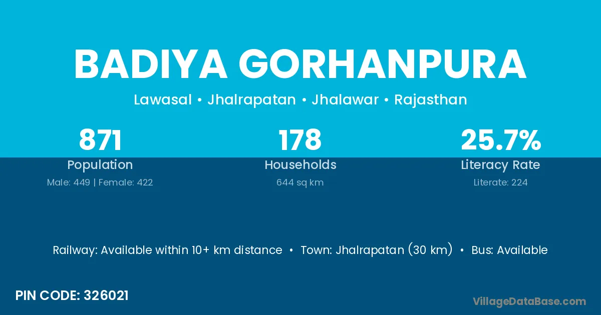 Jhalrapatan (30 km) is the nearest town to Badiya Gorhanpura village for major economic activities and is located approximately 30 km away.