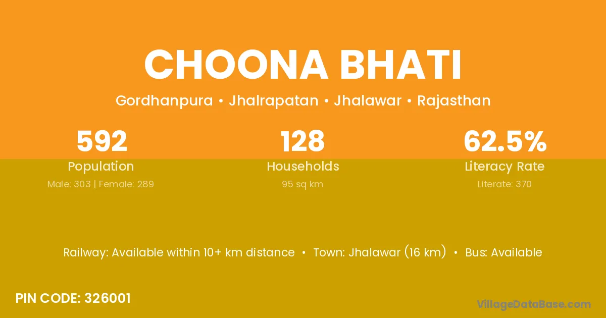 Jhalawar (16 km) is the nearest town to Choona Bhati village for major economic activities and is located approximately 16 km away.