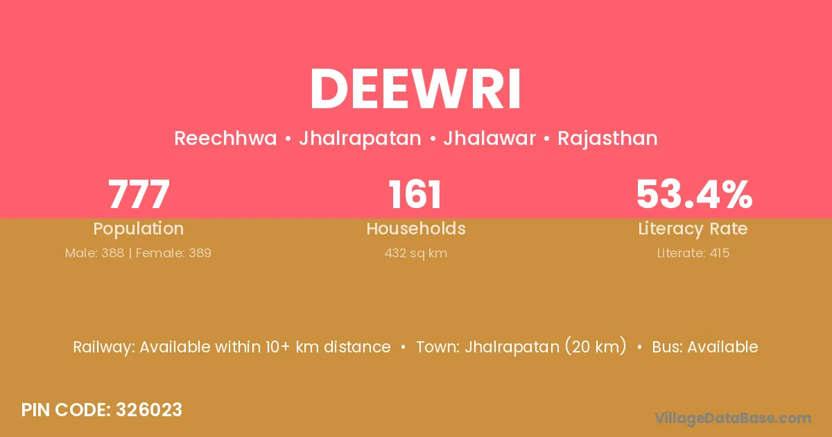 Jhalrapatan (20 km) is the nearest town to Deewri village for major economic activities and is located approximately 20 km away.