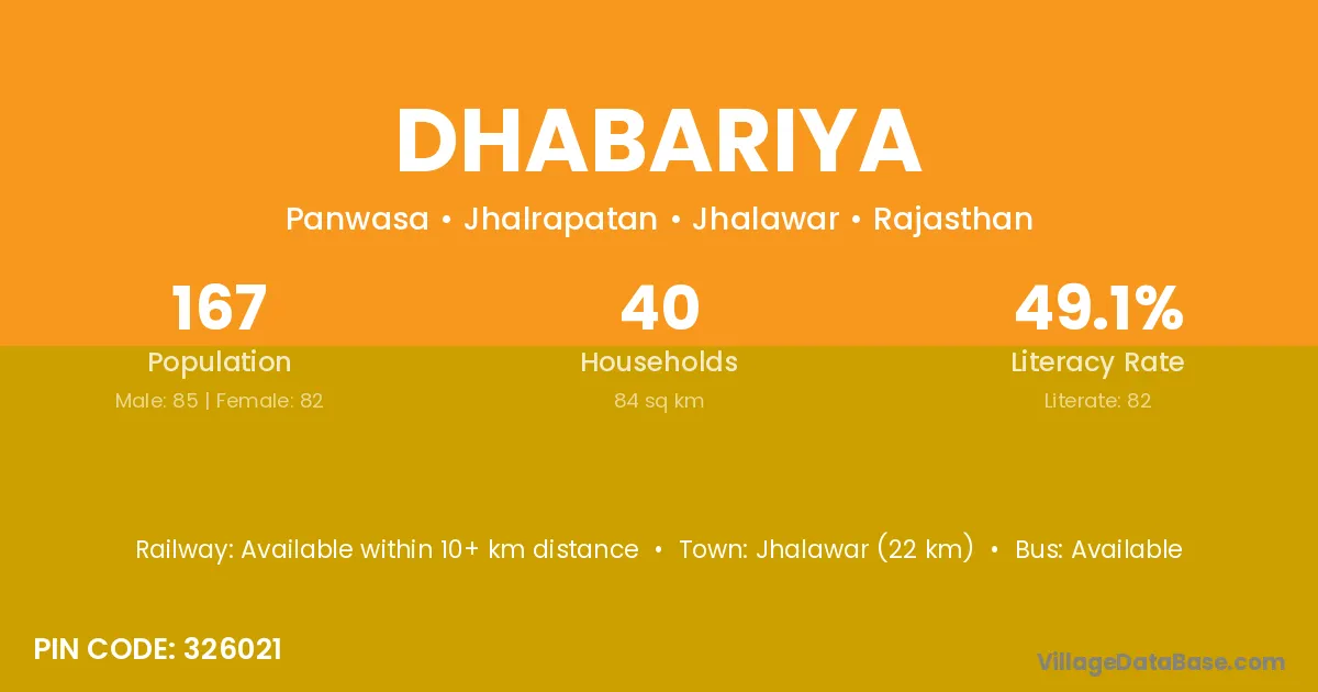 Jhalawar (22 km) is the nearest town to Dhabariya village for major economic activities and is located approximately 22 km away.