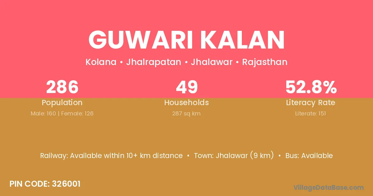 Jhalawar (9 km) is the nearest town to Guwari Kalan village for major economic activities and is located approximately 9 km away.