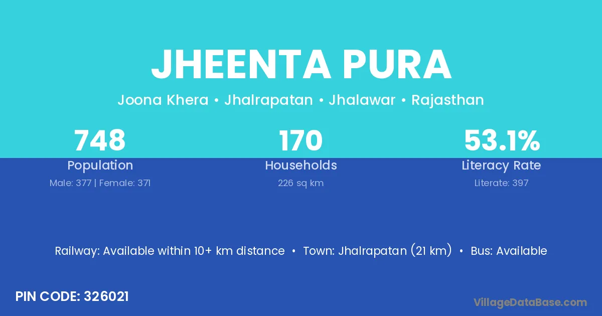 Jhalrapatan (21 km) is the nearest town to Jheenta Pura village for major economic activities and is located approximately 21 km away.