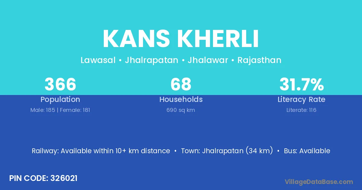 Kans Kherli village has a total population of 366 people, of which 185 are males and 181 are females.