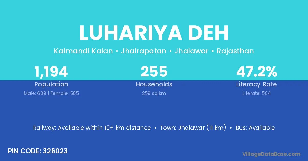 Jhalawar (11 km) is the nearest town to Luhariya Deh village for major economic activities and is located approximately 11 km away.