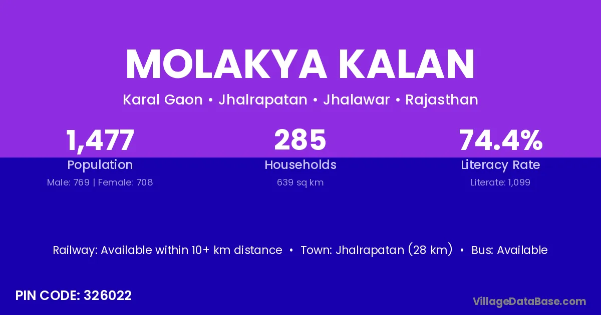 Jhalrapatan (28 km) is the nearest town to Molakya Kalan village for major economic activities and is located approximately 28 km away.