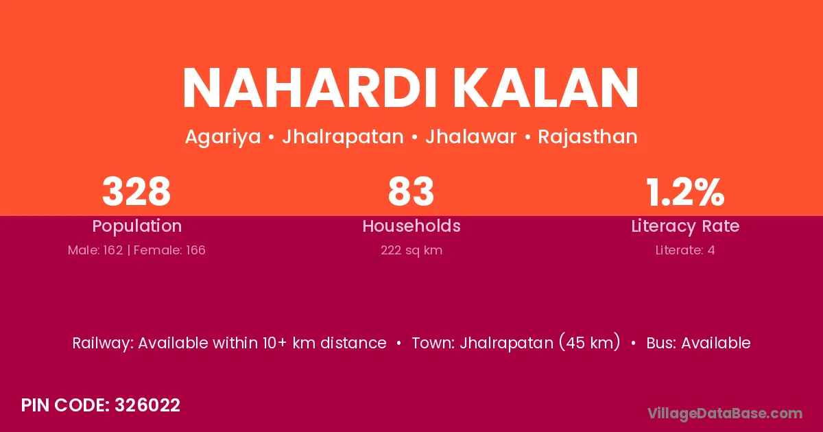 Jhalrapatan (45 km) is the nearest town to Nahardi Kalan village for major economic activities and is located approximately 45 km away.