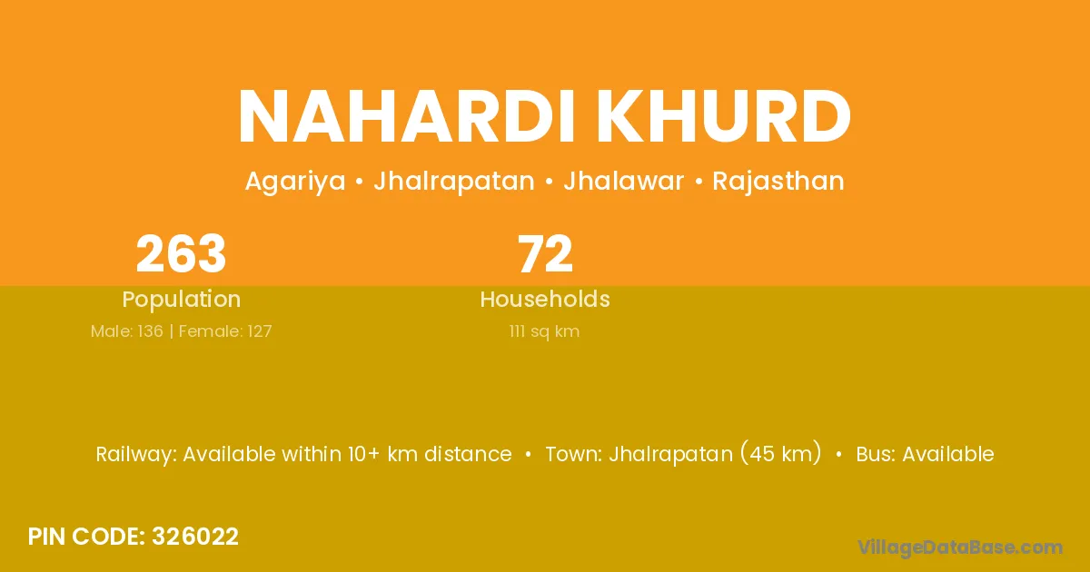 Jhalrapatan (45 km) is the nearest town to Nahardi Khurd village for major economic activities and is located approximately 45 km away.