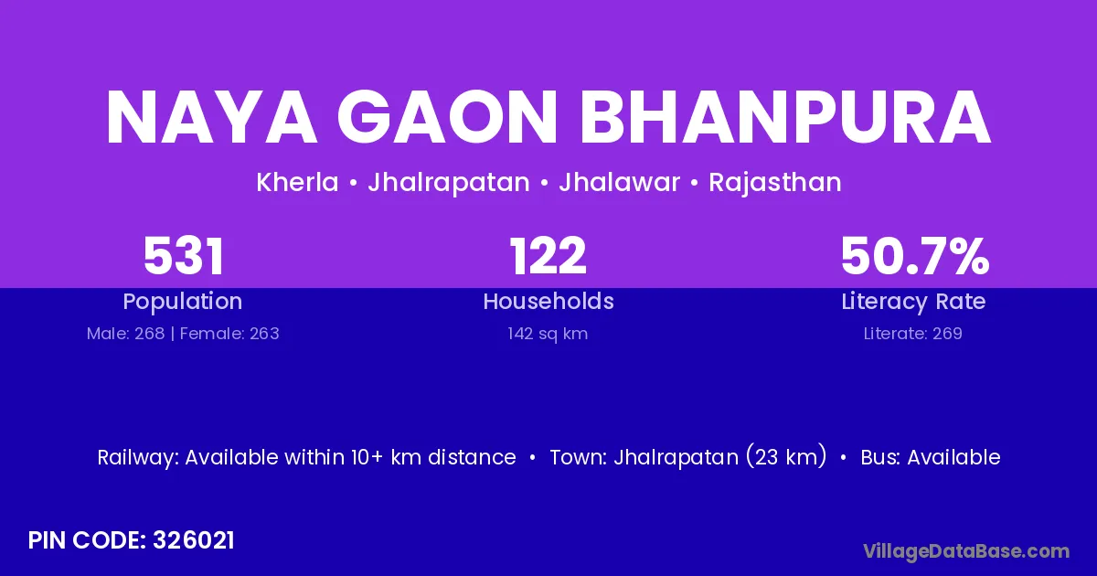 Naya Gaon Bhanpura village has a total population of 531 people, of which 268 are males and 263 are females.
