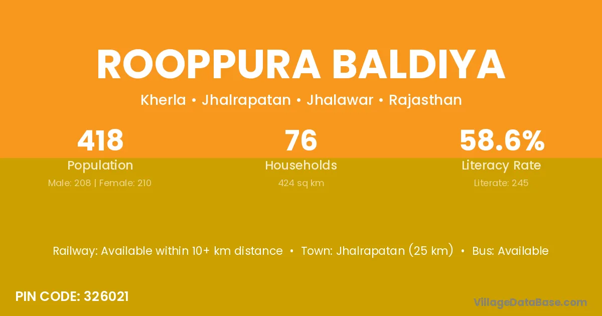 Jhalrapatan (25 km) is the nearest town to Rooppura Baldiya village for major economic activities and is located approximately 25 km away.