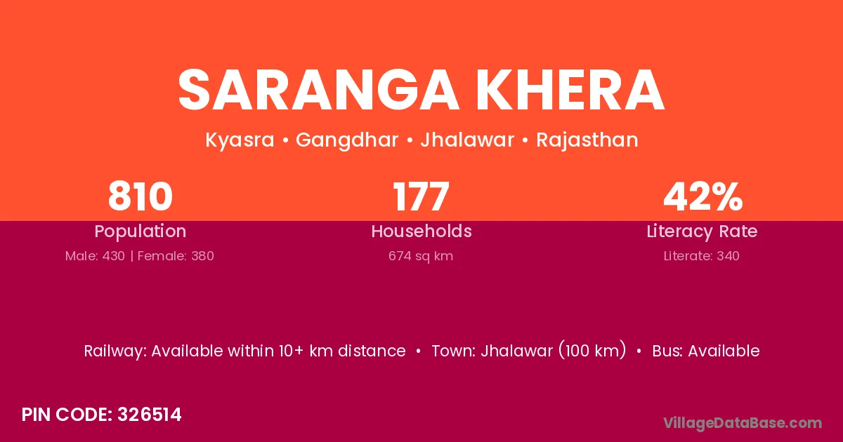 Jhalrapatan (6 km) is the nearest town to Saranga Khera village for major economic activities and is located approximately 6 km away.