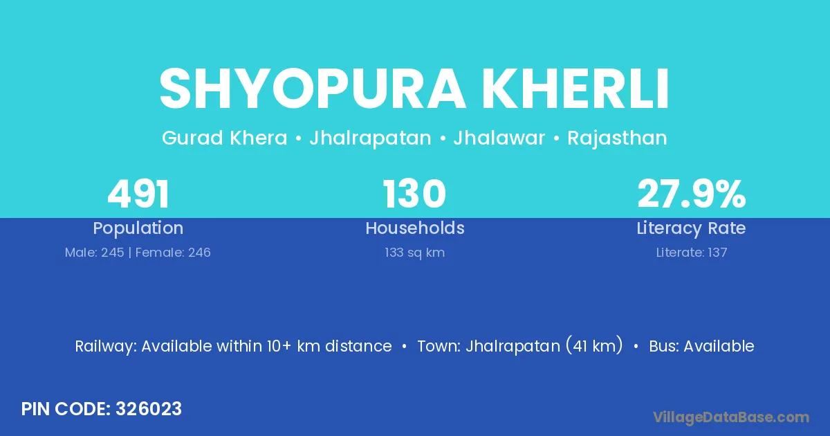 Shyopura Kherli village has a total population of 491 people, of which 245 are males and 246 are females.