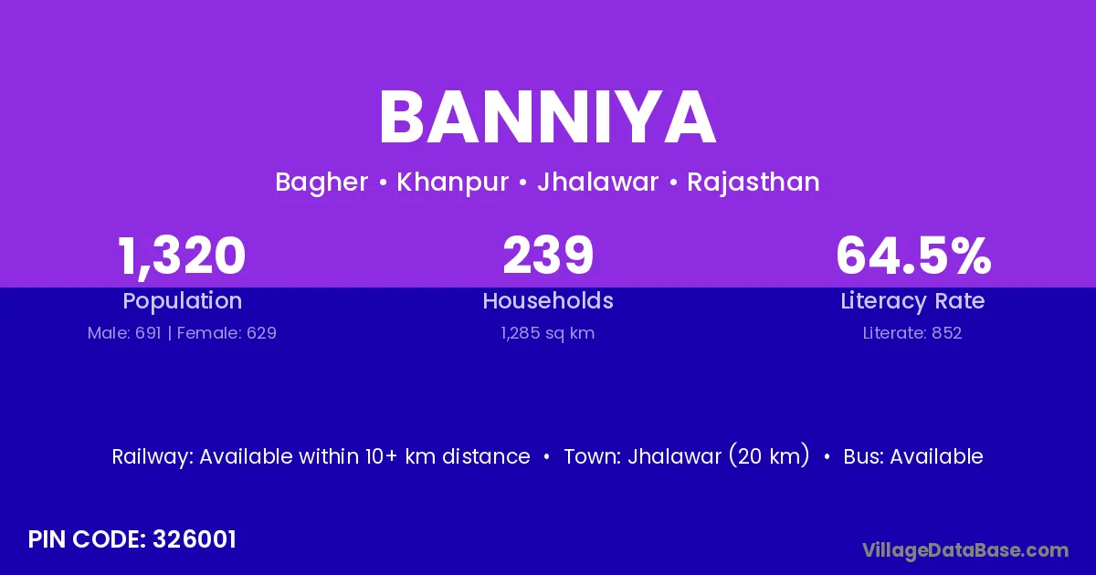Jhalawar (20 km) is the nearest town to Banniya village for major economic activities and is located approximately 20 km away.