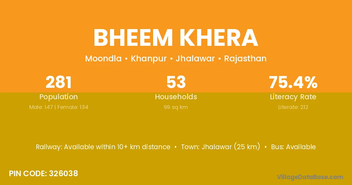 Jhalawar (25 km) is the nearest town to Bheem Khera village for major economic activities and is located approximately 25 km away.