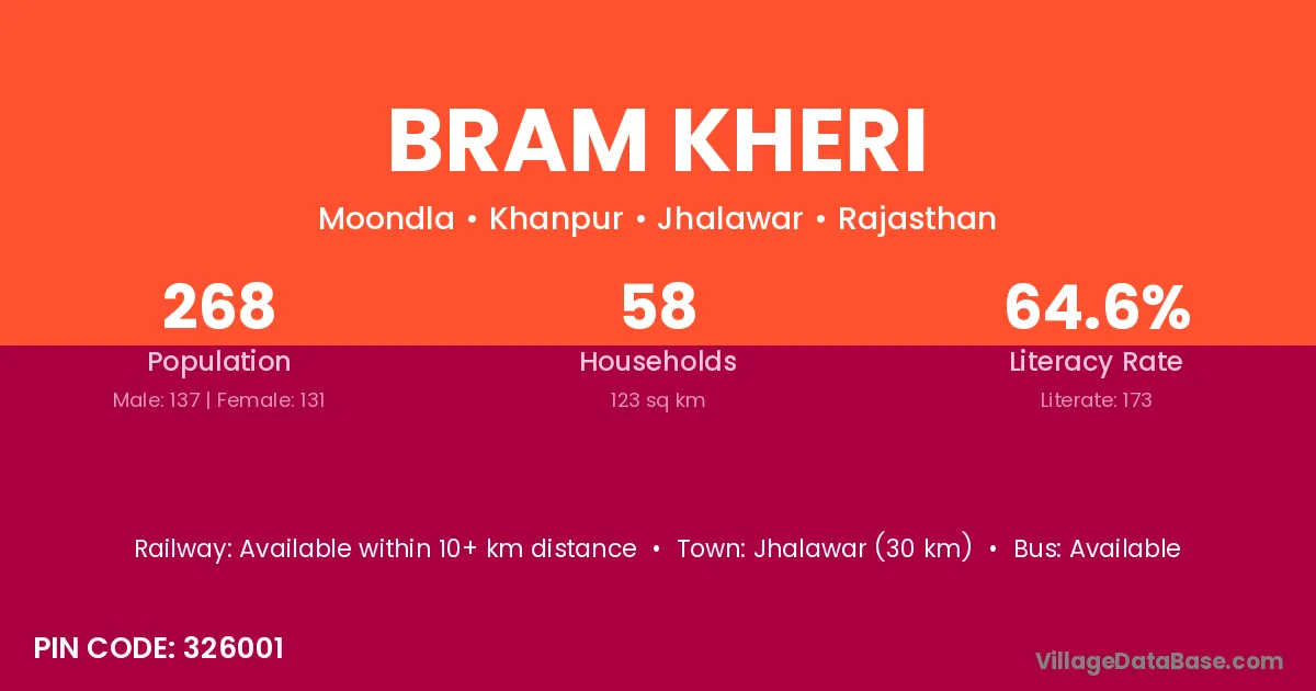 Jhalawar (30 km) is the nearest town to Bram Kheri village for major economic activities and is located approximately 30 km away.