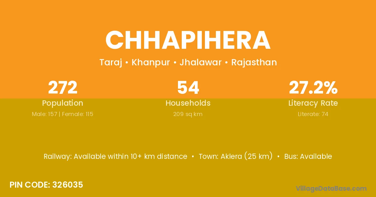 Aklera (25 km) is the nearest town to Chhapihera village for major economic activities and is located approximately 25 km away.