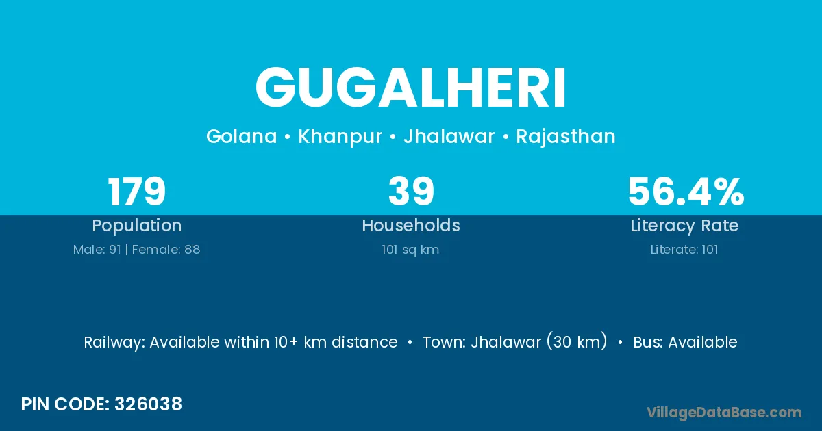 Jhalawar (30 km) is the nearest town to Gugalheri village for major economic activities and is located approximately 30 km away.