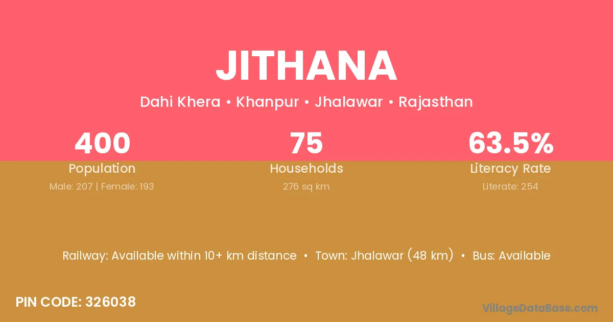 Jhalawar (48 km) is the nearest town to Jithana village for major economic activities and is located approximately 48 km away.