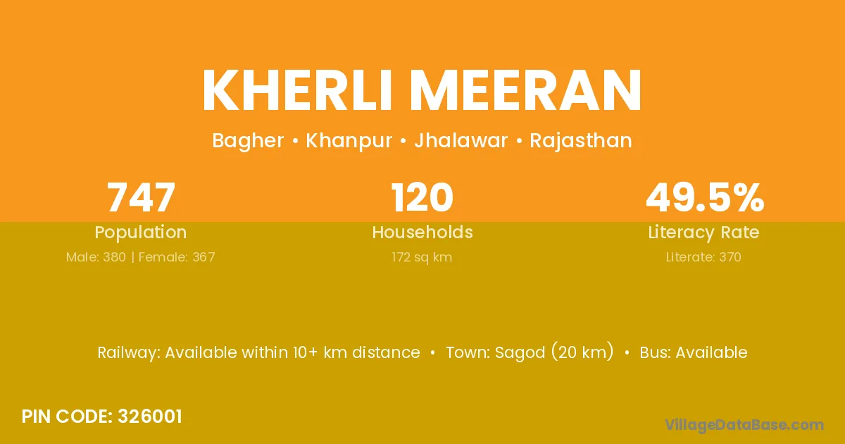 Sagod (20 km) is the nearest town to Kherli Meeran village for major economic activities and is located approximately 20 km away.