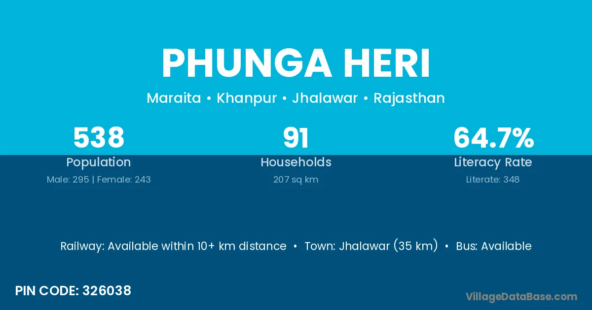 Jhalawar (35 km) is the nearest town to Phunga Heri village for major economic activities and is located approximately 35 km away.