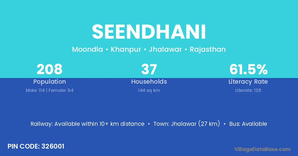 Jhalawar (27 km) is the nearest town to Seendhani village for major economic activities and is located approximately 27 km away.
