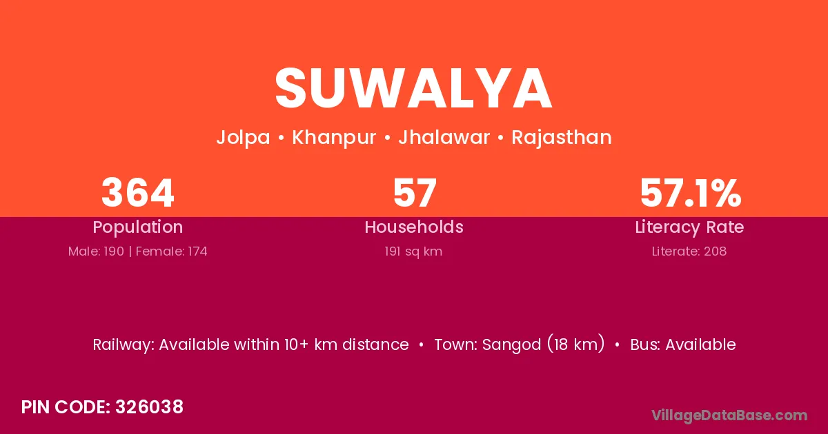Sangod (18 km) is the nearest town to Suwalya village for major economic activities and is located approximately 18 km away.