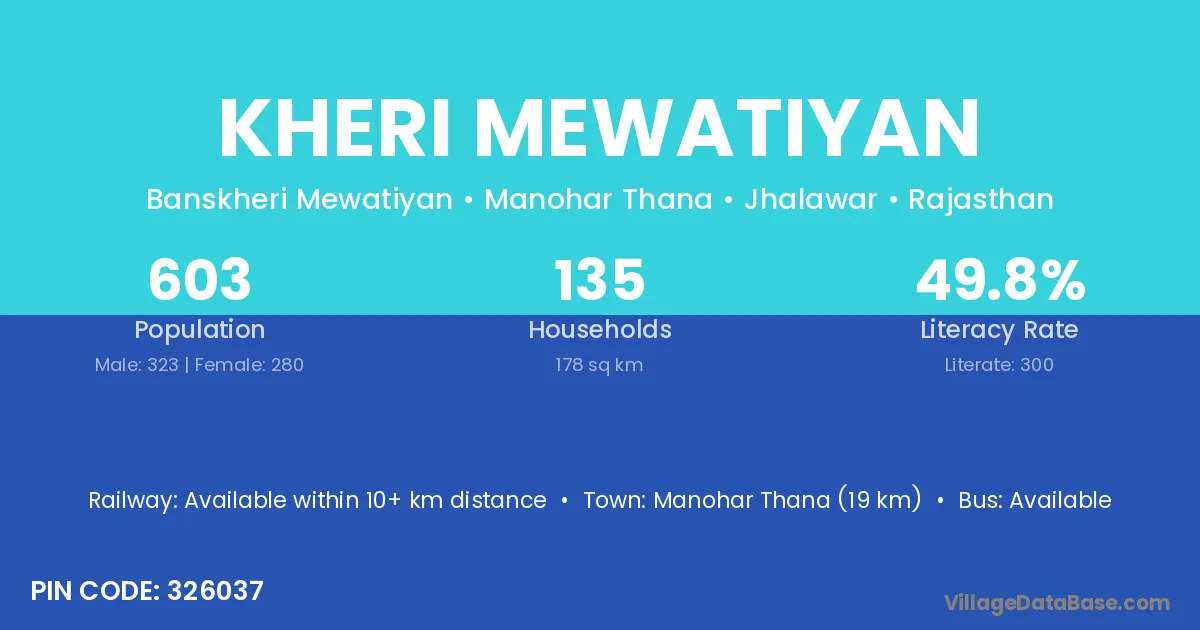 Manohar Thana (19 km) is the nearest town to Kheri Mewatiyan village for major economic activities and is located approximately 19 km away.