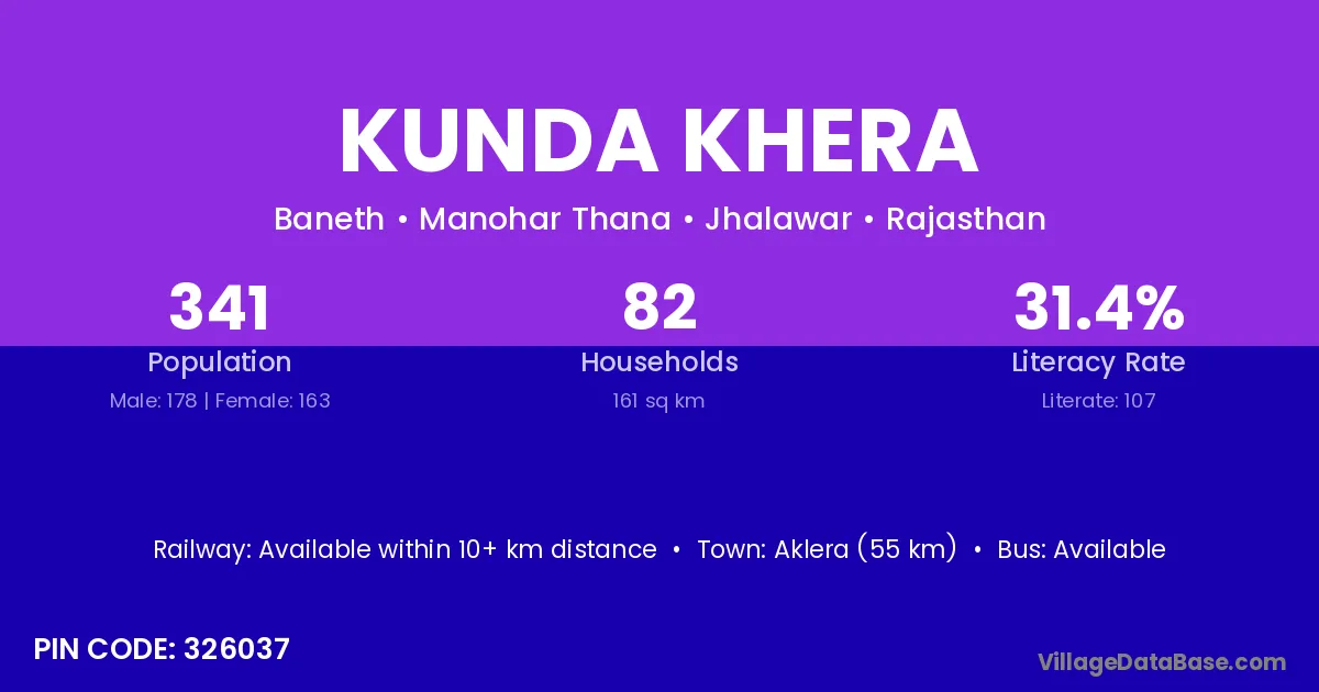 Aklera (55 km) is the nearest town to Kunda Khera village for major economic activities and is located approximately 55 km away.