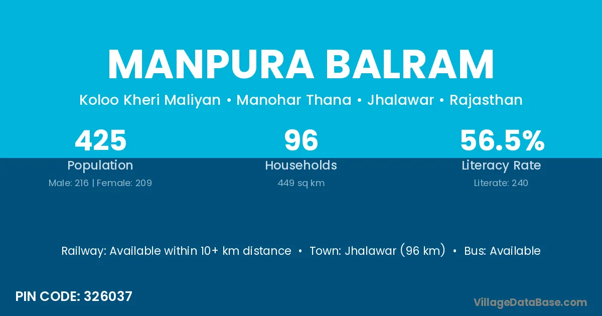 Jhalawar (96 km) is the nearest town to Manpura Balram village for major economic activities and is located approximately 96 km away.