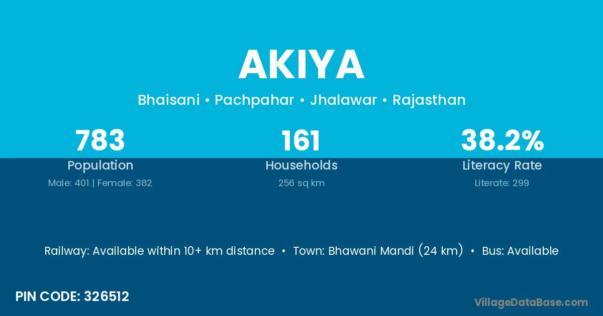 Bhawani Mandi (24 km) is the nearest town to Akiya village for major economic activities and is located approximately 24 km away.