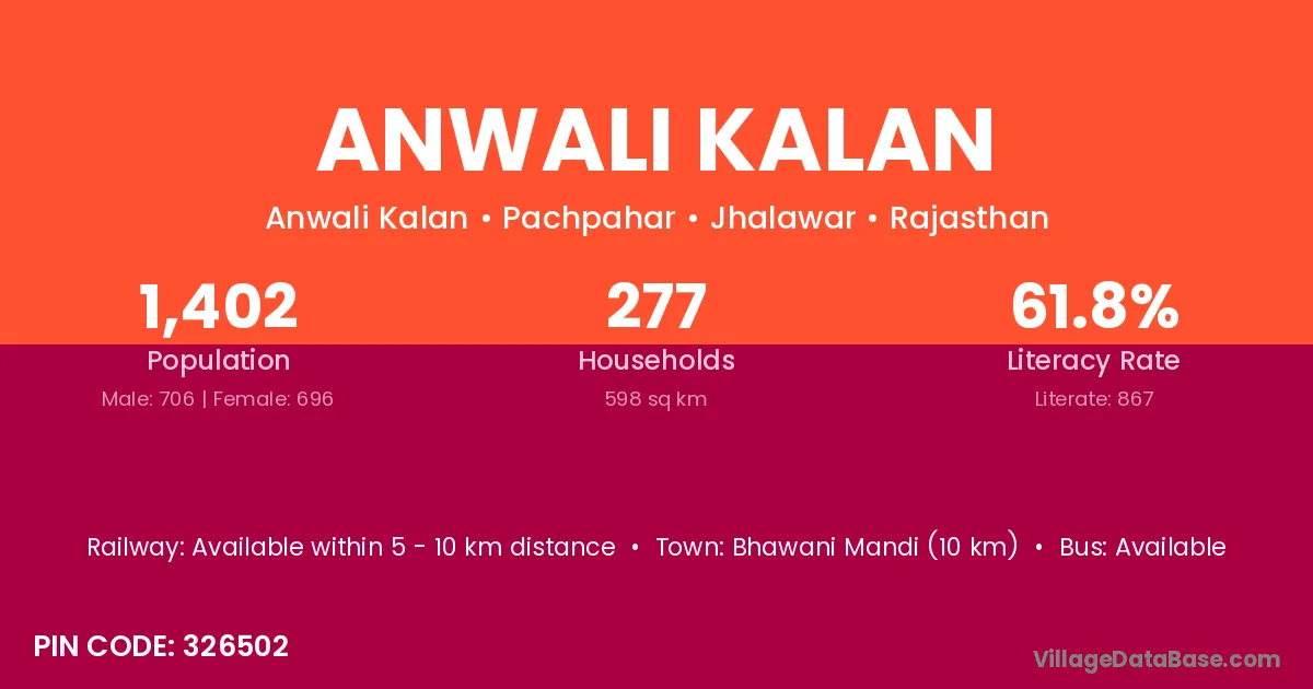 Bhawani Mandi (10 km) is the nearest town to Anwali Kalan village for major economic activities and is located approximately 10 km away.