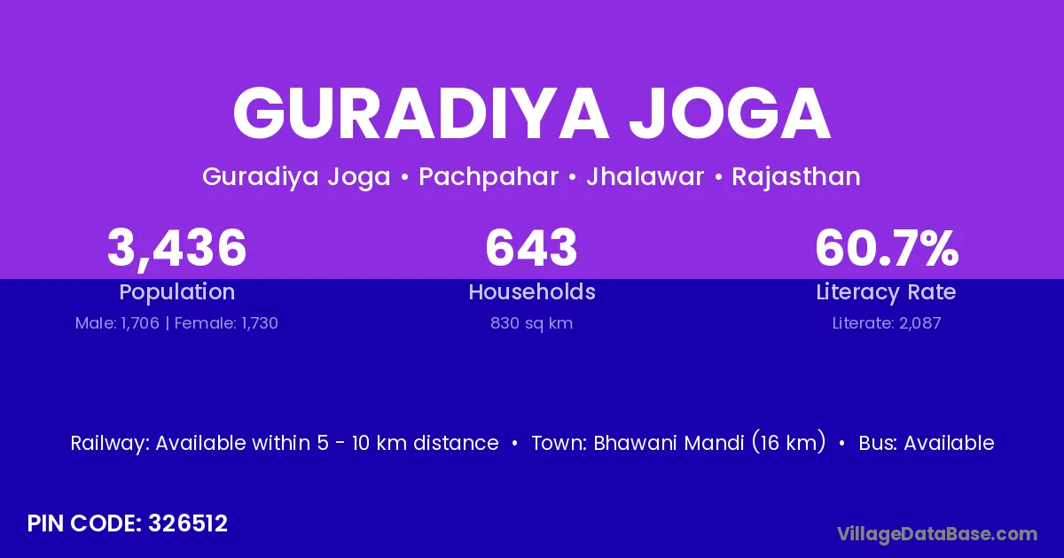 Bhawani Mandi (16 km) is the nearest town to Guradiya Joga village for major economic activities and is located approximately 16 km away.