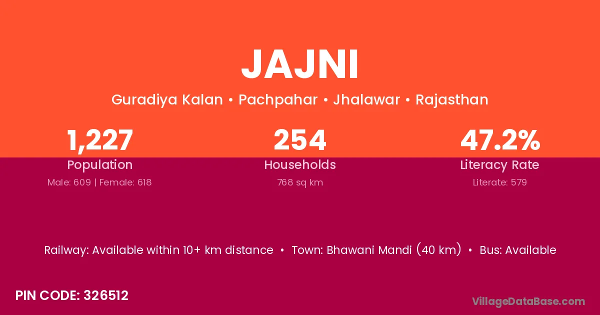 Bhawani Mandi (40 km) is the nearest town to Jajni village for major economic activities and is located approximately 40 km away.