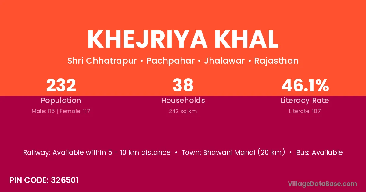 Bhawani Mandi (20 km) is the nearest town to Khejriya Khal village for major economic activities and is located approximately 20 km away.