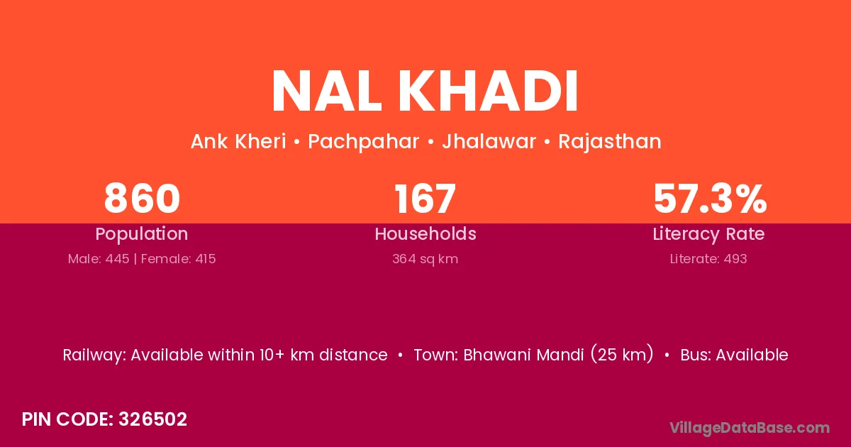 Bhawani Mandi (25 km) is the nearest town to Nal Khadi village for major economic activities and is located approximately 25 km away.