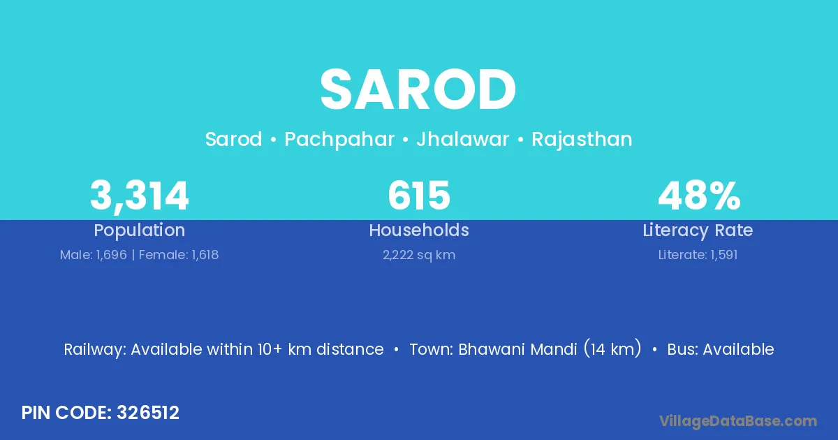 Bhawani Mandi (14 km) is the nearest town to Sarod village for major economic activities and is located approximately 14 km away.