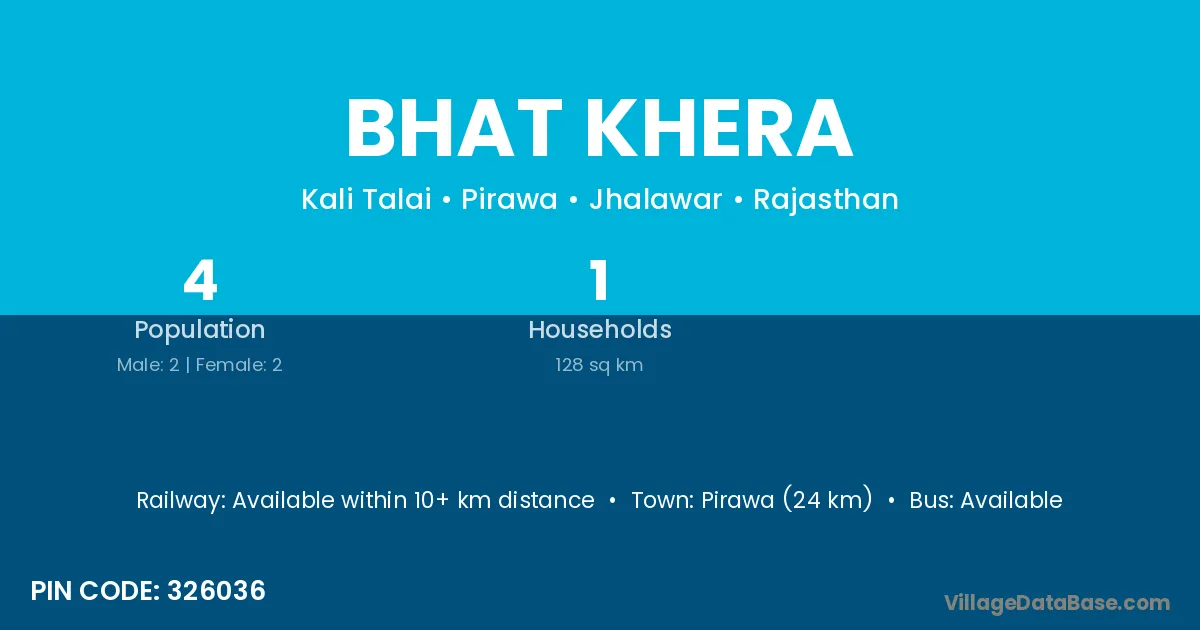 Pirawa (24 km) is the nearest town to Bhat Khera village for major economic activities and is located approximately 24 km away.