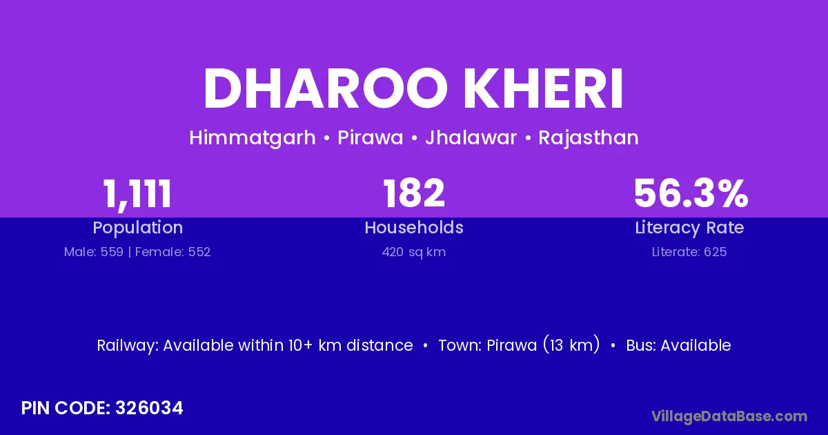 Pirawa (13 km) is the nearest town to Dharoo Kheri village for major economic activities and is located approximately 13 km away.