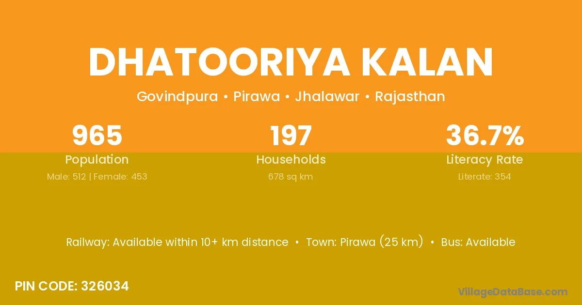 Pirawa (25 km) is the nearest town to Dhatooriya Kalan village for major economic activities and is located approximately 25 km away.
