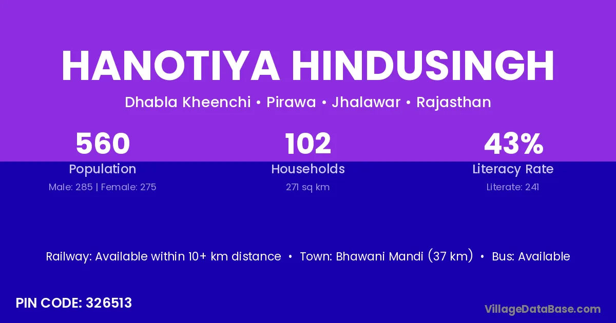 Bhawani Mandi (37 km) is the nearest town to Hanotiya Hindusingh village for major economic activities and is located approximately 37 km away.