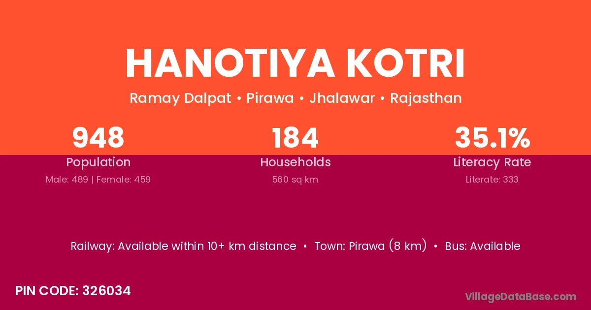Pirawa (8 km) is the nearest town to Hanotiya Kotri village for major economic activities and is located approximately 8 km away.