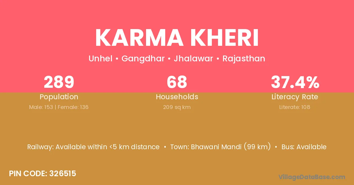 Bhawani Mandi (33 km) is the nearest town to Karma Kheri village for major economic activities and is located approximately 33 km away.