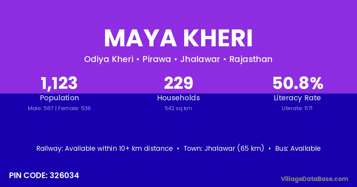 Jhalawar (65 km) is the nearest town to Maya Kheri village for major economic activities and is located approximately 65 km away.