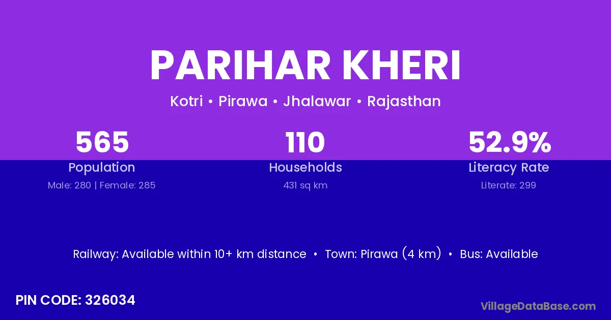 Pirawa (4 km) is the nearest town to Parihar Kheri village for major economic activities and is located approximately 4 km away.