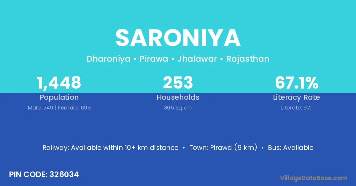 Pirawa (9 km) is the nearest town to Saroniya village for major economic activities and is located approximately 9 km away.