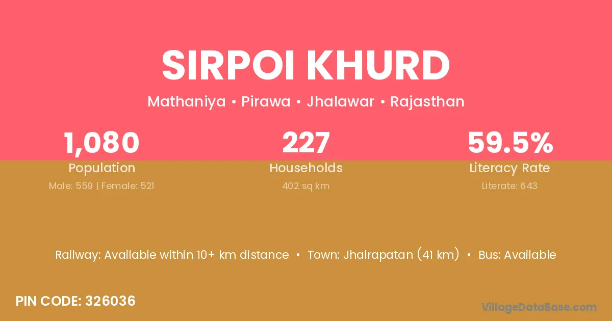 Jhalrapatan (41 km) is the nearest town to Sirpoi Khurd village for major economic activities and is located approximately 41 km away.